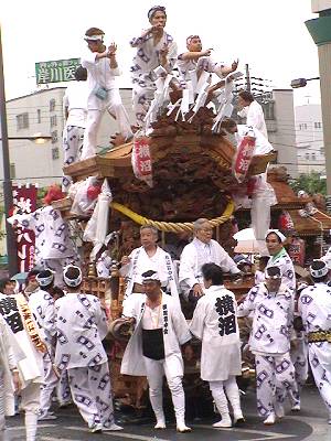 霧雨状態で降ったり止んだりしていた雨が途中から本降りになり、曳行されている方々やだんじりには気の毒でしたが、各町とも元気一杯、雨を吹き飛ばす勢いでした。
