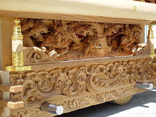 今回は、金網を外すとのことでしたので、ご好意に甘え、平成16年6月20日にお邪魔しました。 当日は、台風の接近による雨が予想されていたのですが、真夏のような好い天気になりました。 軽里に着いたときには、金網を外されているところでした。 その後、梯子も外され、新調だんじりの立派な彫り物を拝見することができました。