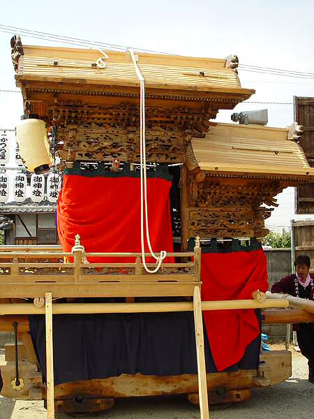 平成16年9月23日、新調された喜志町のだんじりを櫻井町のだんじりが出迎えました。 その準備中の櫻井町にお邪魔して、写真を撮らせてもらっていると、まだ時間ではなかったのに小屋からだんじりを出して下さいました。 また、飲み物まで頂戴いたしました。 櫻井町のみなさん、お世話になりありがとうございました。