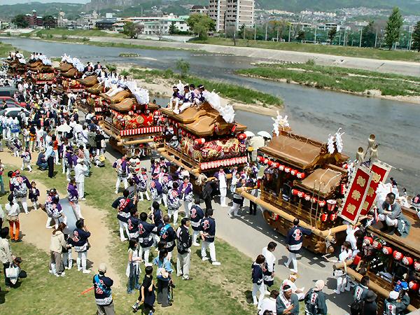 宝塚市制50周年記念事業の一環としてだんじりが曳行されました。 さわやかな好天に恵まれたこの日、会場では、フリーマーケットや模擬店、ステージでのダンス・コーラスなどが開かれ、たくさんの人出で賑わっていました。