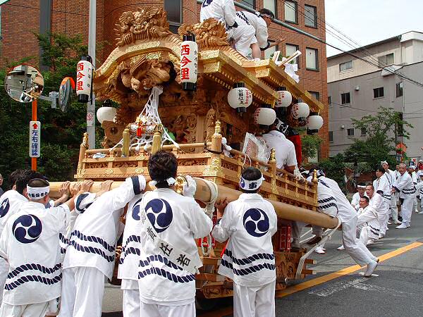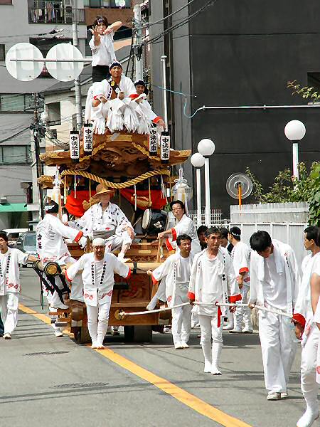 平成17年7月17日、大阪市東成区の祭礼に行きました。 八王子神社近くでの中本、中道、西今里、中浜(城東区)の交歓風景を紹介します。 夏真っ盛りで、みなさん、汗びっしょりの曳行でした。