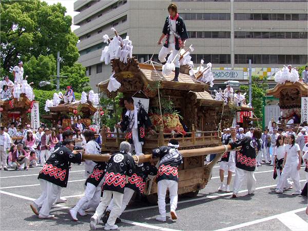 平成22年5月9日、京阪守口市駅前で第4回守口市だんじり祭が行われ、10台のだんじりが集まりました。 この日も良い天気に恵まれ、模擬店も出ていて、たくさんの人が来られていました。