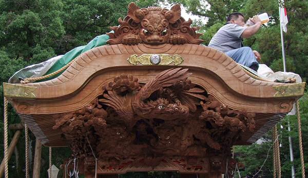 板の上に滑り止めの樹脂板が敷かれ、だんじりが上がります |