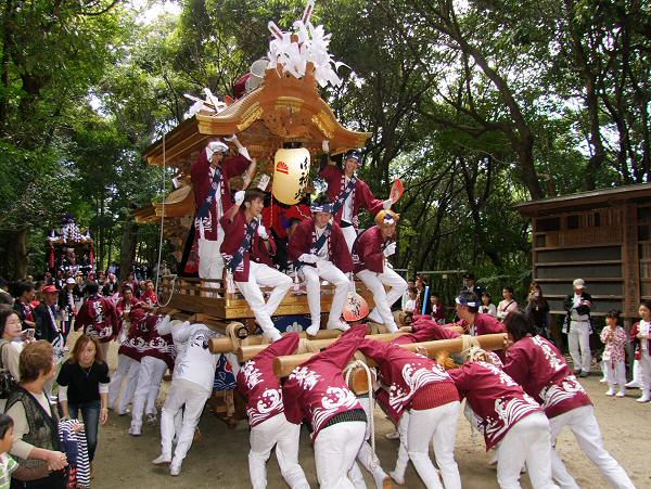 平成24年10月13日、錦織神社で各町の宮入が終わってすぐに春日神社に行きました。 だんじりは神社のすぐ近くまで来ていましたが、なんとか間に合って3台の宮入を見ることができました。