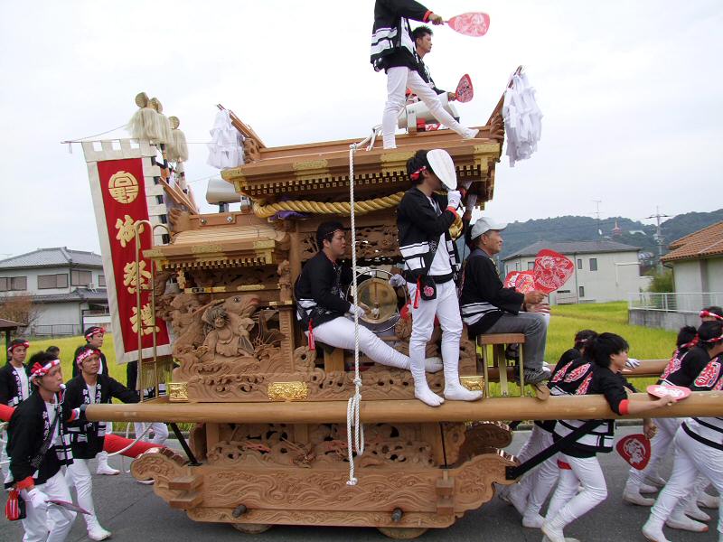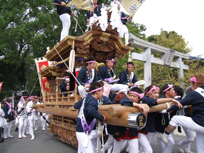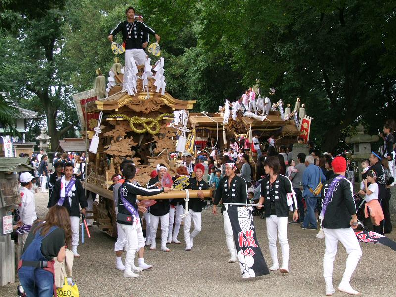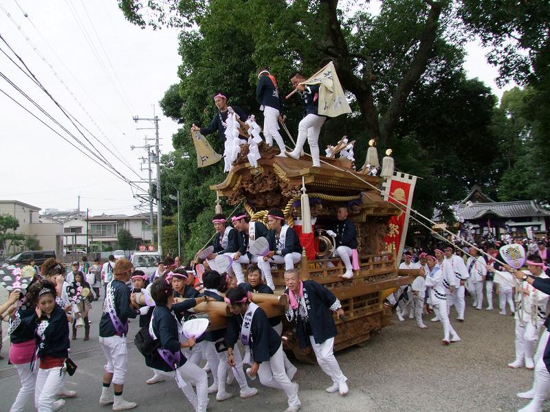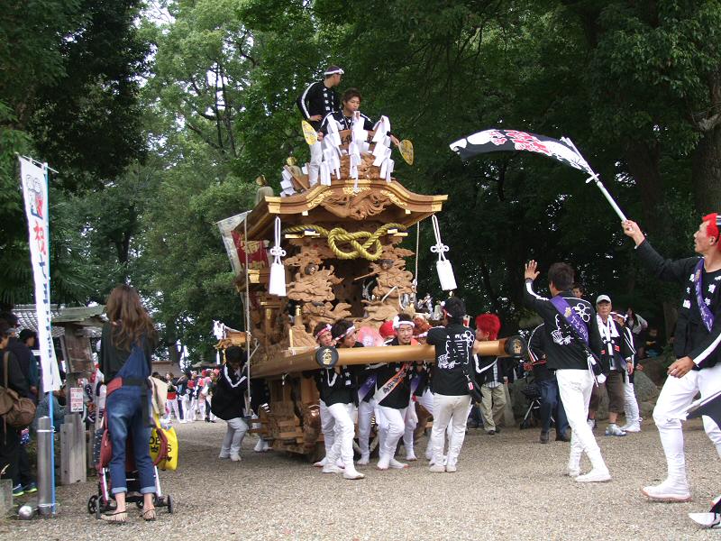 平成26年10月11日、河内長野市千代田神社に行きました。 お昼頃に千代田神社に着くと、市町西のだんじりが宮出して来るところで、続いて千代田石坂が宮出して来ました。 この後、他のだんじりは境内に並んだままで、次の楠町が宮出したのは、1時間近く後でした。 千代田地区の宮出の写真をご覧ください。