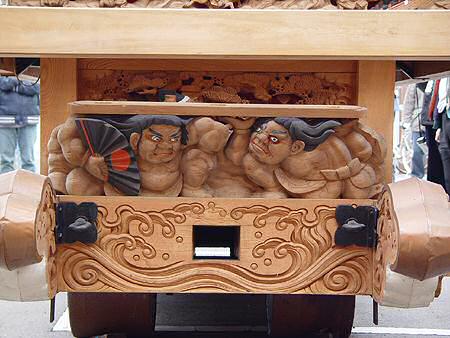 正面獅子噛(泉大津では「鬼熊」と呼ぶ)と懸魚です | 正面車板と虹梁です |