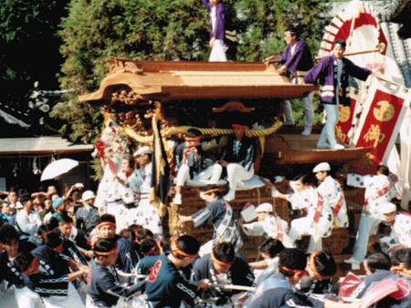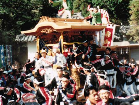 平成元年10月9日、熊取町大森神社宮入の様子です。 熊取の祭礼は、この時が初めてでしたが、境内をだんじりがまわる宮入を見せていただきました。