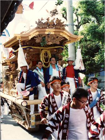 昭和63年堺市西区津久野地区祭礼より連合曳きの様子です。 全町が上だんじりで、屋根に蝶番が取り付けられていて、狭い道を曳行する時には屋根を跳ね上げる町もありました。 紹介している写真でも屋根を跳ね上げている町があります。 写真のだんじりは、津久野地区にはもう1台も残っていません。 宮山組が折衷型を新調した他は、全て下だんじりを新調しました。