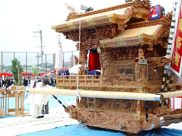 平成14年5月11日に富田林市伏山の新調入魂式が行われました。 心配だった雨は、入魂式までにあがって良かったです。 このだんじりは、舞台の付いた石川型に、下だんじり式の立体見送りや堺型の良さも取り入れた立派なだんじりです。
