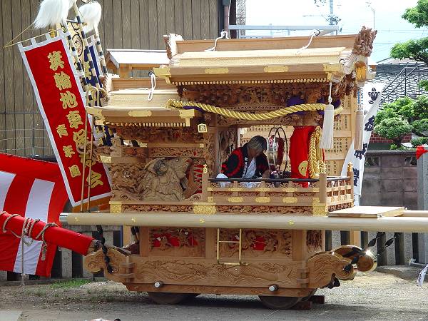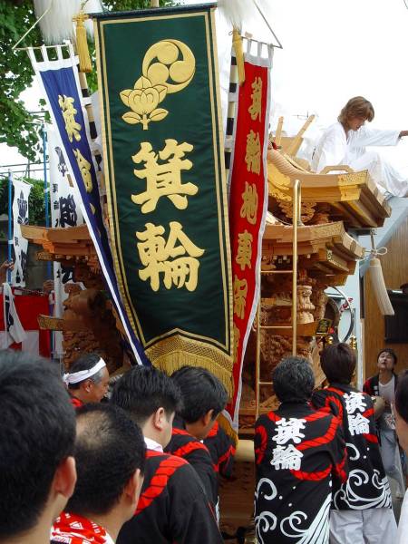 平成15年8月31日に東大阪市箕輪が購入しただんじりの入魂式が行われました。 残暑が厳しかったこの日、入魂式には近隣町の方々を始め、元の所有町である和泉市下伯太の方々も出席されていました。 だんじりは修理に際して、見送りが下だんじり式の立体見送りから、先代だんじりの彫り物を利用した三枚板に変更されていました。
