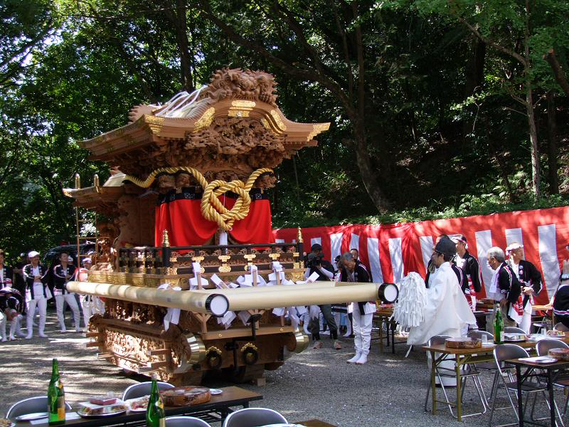 平成26年9月21日、大阪狭山市池之原のだんじりが新調され、池ノ原神社で入魂式を行いました。 摺り出しを廃した後ろ正面は見送り三枚板が引き立っていました。 とても立派な彫り物の素晴らしいだんじりでした。 今年の秋祭りが楽しみです。