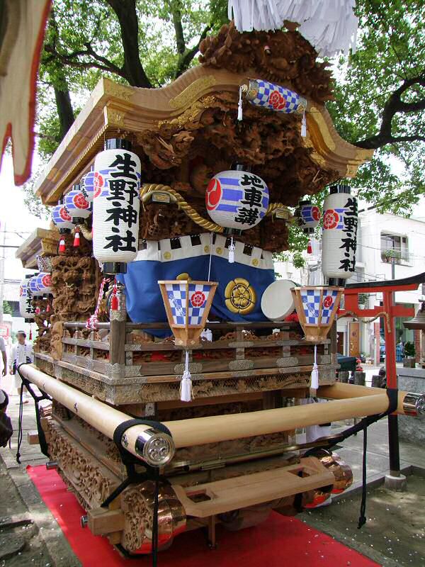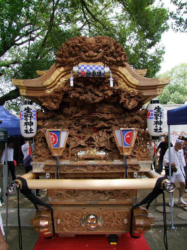 平成27年7月12日、大阪市生野区の生野神社地車講の入魂式が行われました。 このだんじりは堺市西区大鳥地区の野田区の先代です。 名だんじりと言われるだけあって、泉州からの見学の人もたくさん来られていました。 また、このだんじりを見本にして製作され、前所有町の野田区とも交流のあった東大阪市北蛇草のだんじりが、お祝いに駆けつけました。