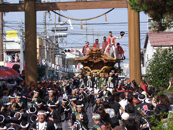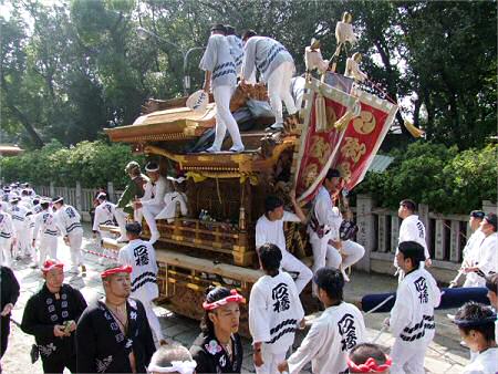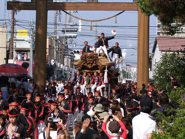 平成21年10月3日、堺市西区鳳大社の宮入の様子です。 だんじりは大鳥大社境内にある、摂社の美波比神社に宮入します。 境内に入ると、鳴り物が岸和田式から懐かしい村の太鼓(鳳地区では大鳥太鼓と呼ぶそうです)に変わる町が多いです。 美波比神社の前には10台のだんじりが整列し、大勢の人でいっぱいになっていました。