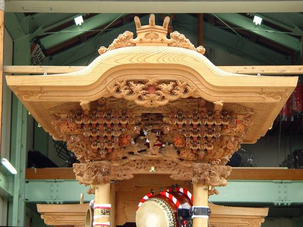 平成14年9月29日、だんじり会館さんが、岸和田市土生滝のだんじりを撮影するということで、網をはずした状態で見学することができました。 修理で取り換えた木下舜次郎師作の松良も見せていただきました。