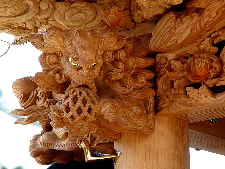 和泉市下伯太のだんじりは、平成15年5月11日に完全完成の新調入魂式を行いました。 入魂式には行けなかったのですが、コマ替えをして網を外すとの情報をいただきお邪魔しました。 彫刻は、楠木正成の統一彫りとのことで、網を外した綺麗なだんじりを拝見できました。