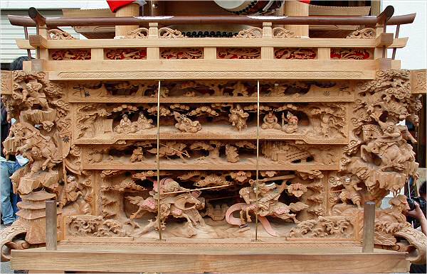 平成18年7月2日、高石市立体育館で北村歴史写真展が開催され、北村(第7区)の懐かしい写真や地図の展示がありました。 この催しの時に、体育館裏に小屋がある北村のだんじりが公開され、金網を外しただんじりを拝見することができました。 午前中は、雨が時折ぱらつく天候でしたが、その都度、だんじりを小屋から出し入れしてくださいました。 北村のみなさん、ありがとうございました。