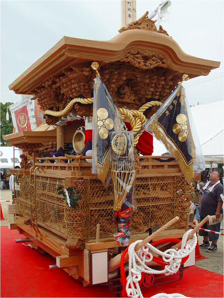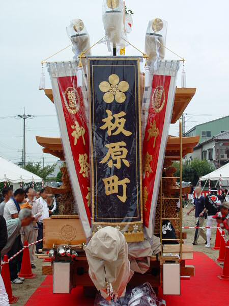 平成18年10月1日、泉大津市板原のだんじりの新調入魂式がありました。 雨模様の天気でしたが式典の途中で雨が上がり、カッパを外されたので写真を撮らせていただきました。 盛大な式典が行われていました。