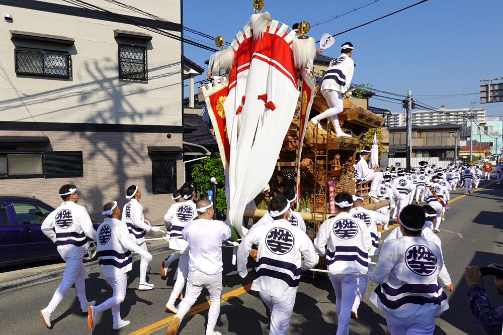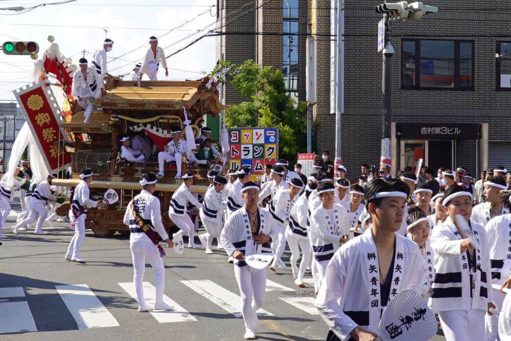 令和4年10月1日、東山交差点で、堺市中区久世地区の野々宮神社氏子町が宮入に出発するのを、多治速比売神社氏子町が見送りする様子です。このページでは野々宮神社に宮入する5町を紹介します。