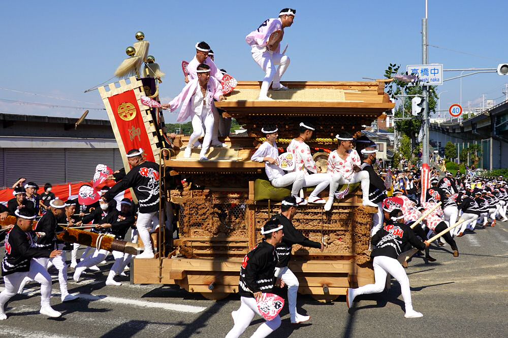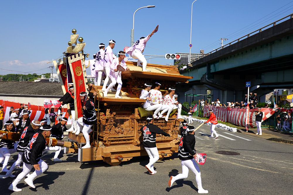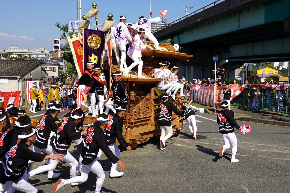 令和4年10月1日、堺市南区美福連合の高橋交差点での連合曳きの様子です。この日は4台の参加とのことでした。