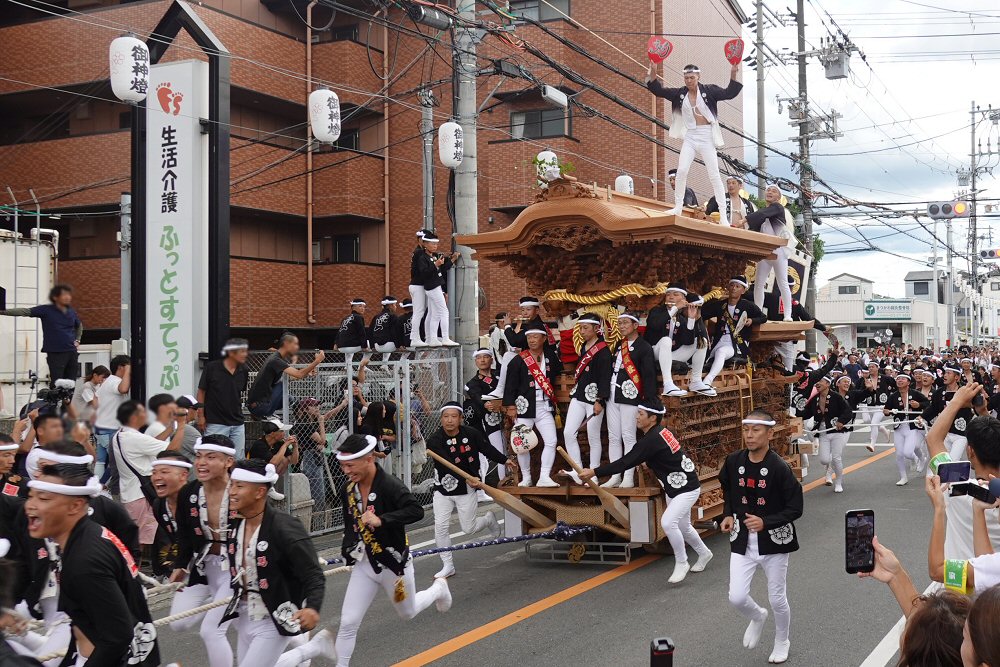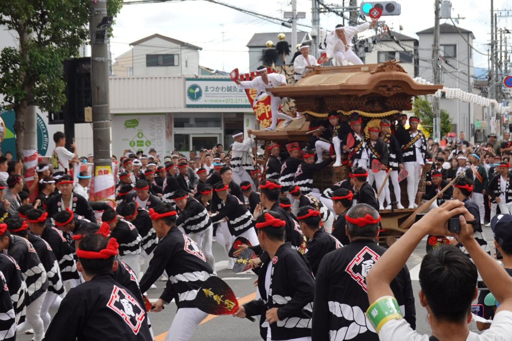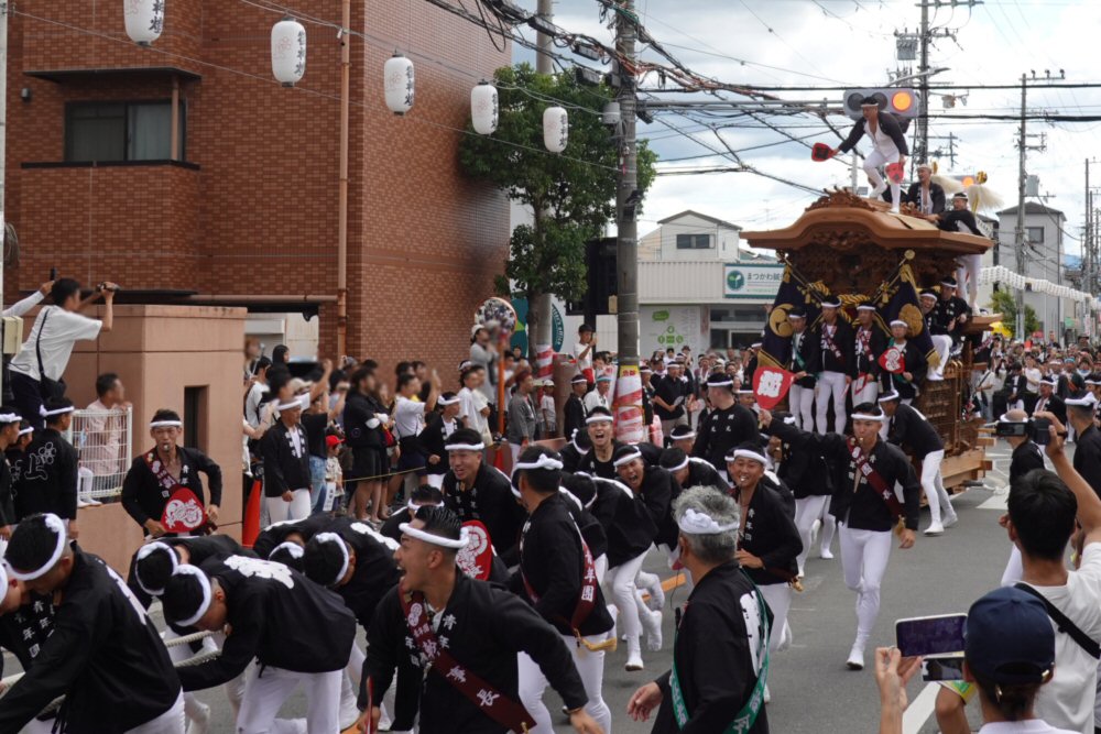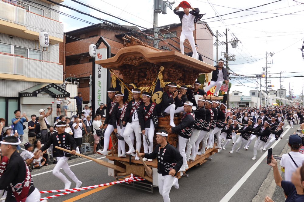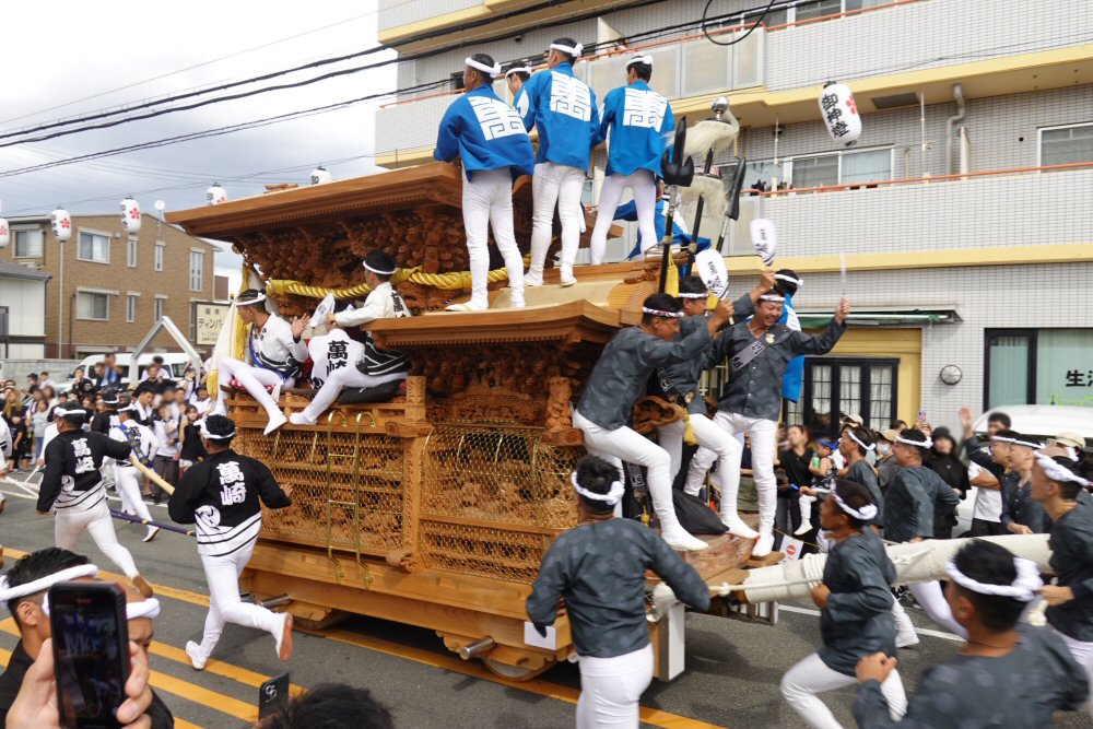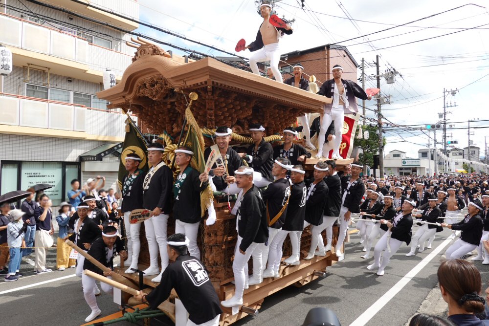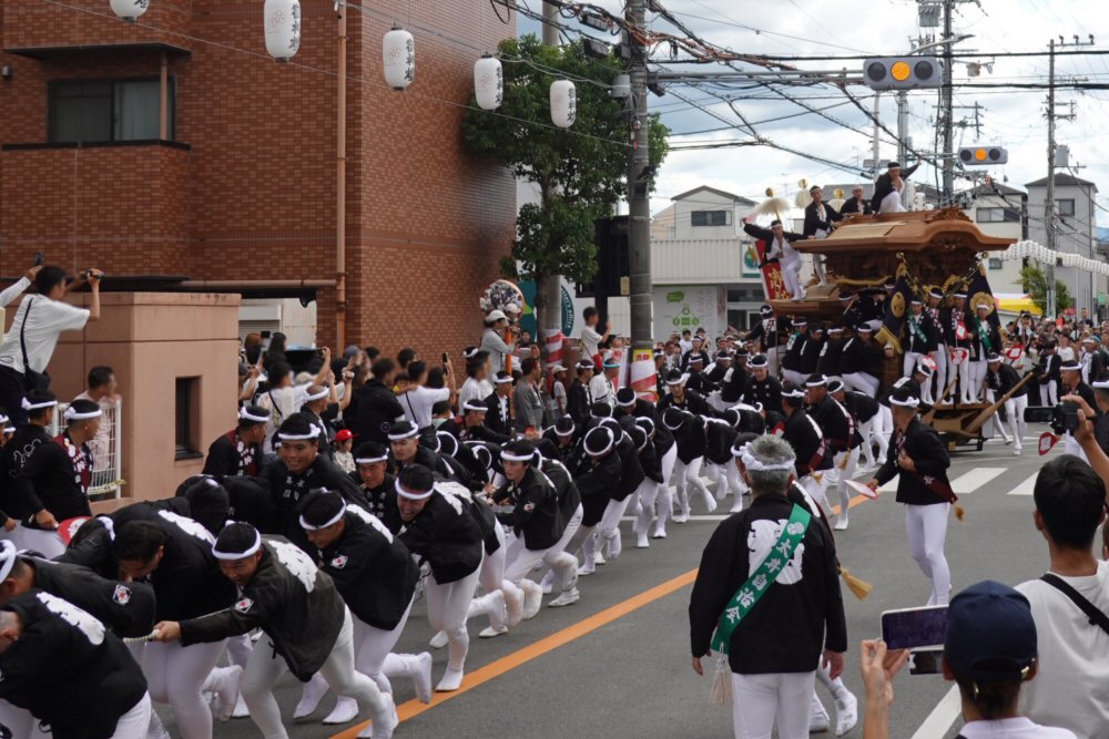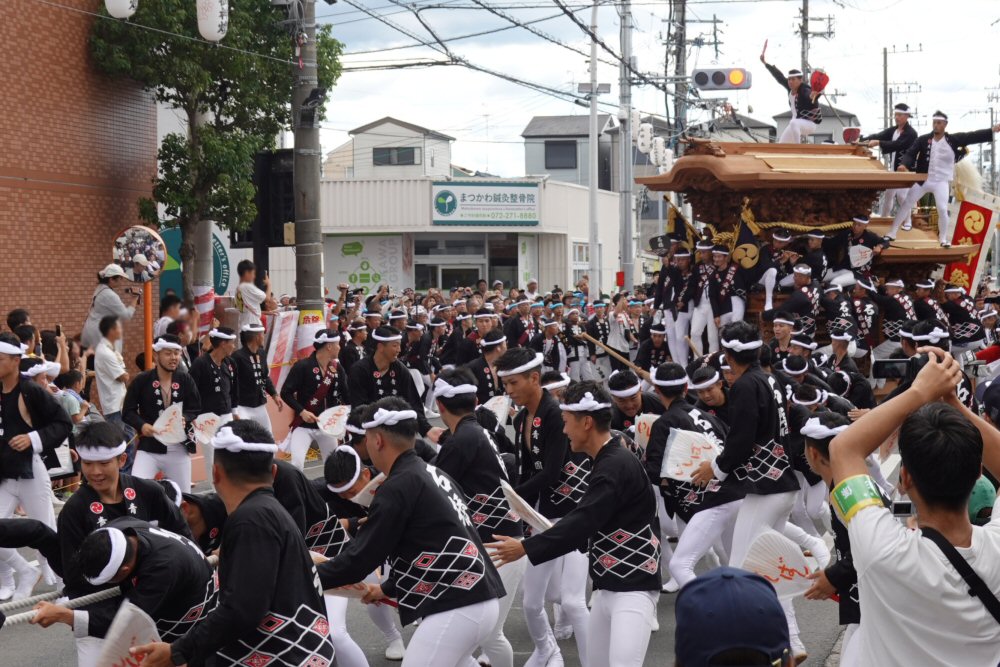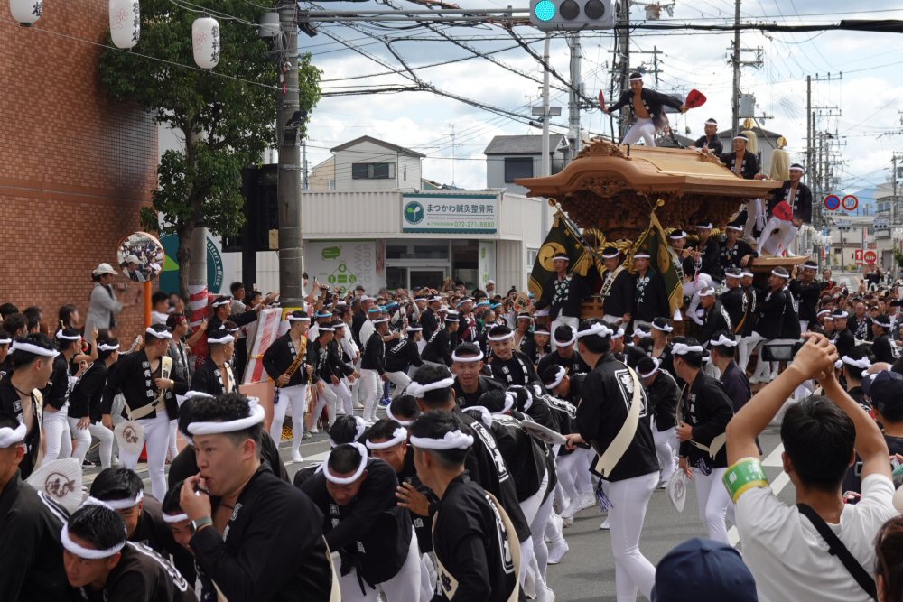 令和7年9月21日、鳳地区と福泉地区試験曳きでの万代前交差点の様子です。 良い天気に恵まれ、暑さも少しやわらいでだんじり日よりでした。