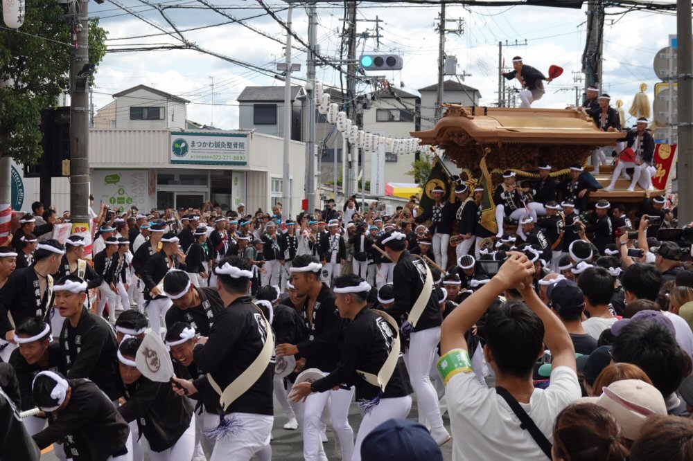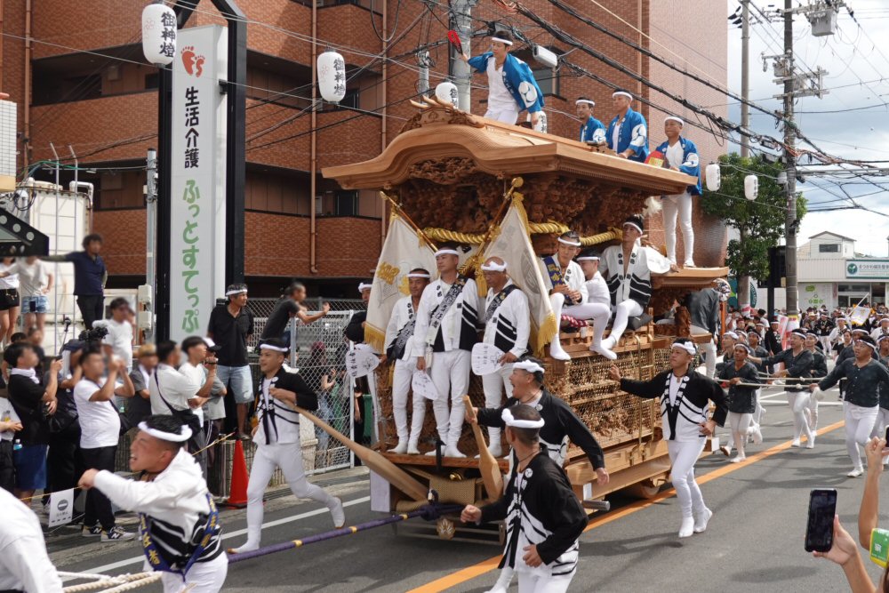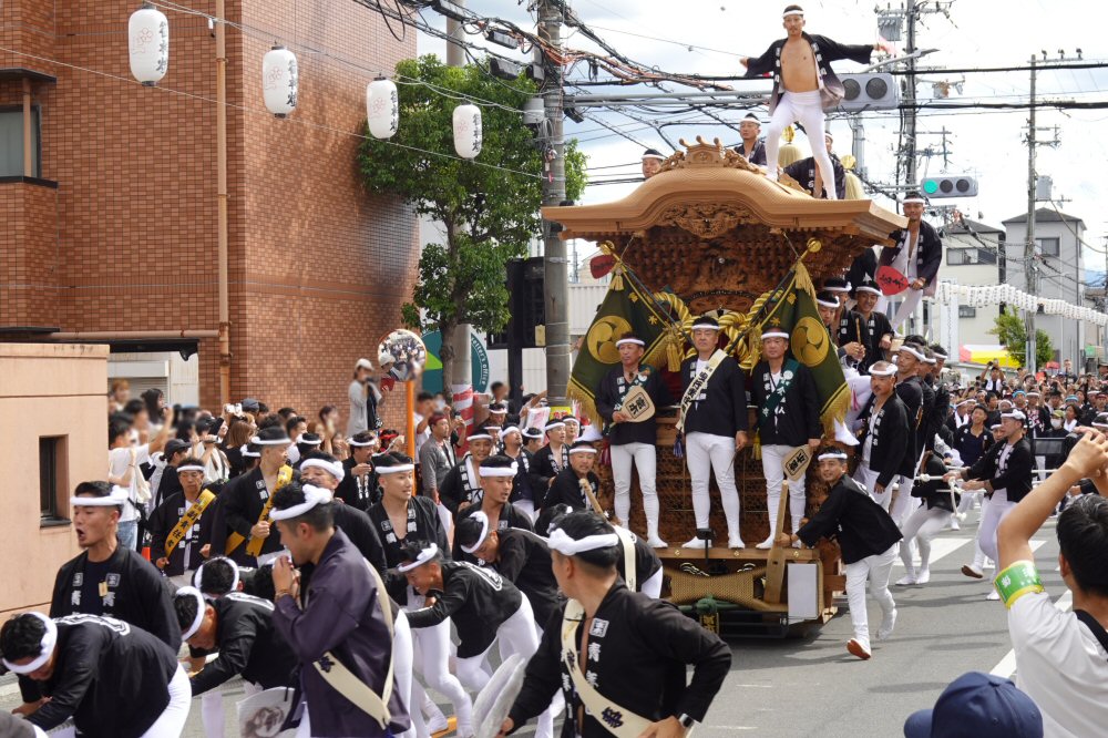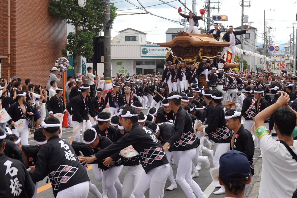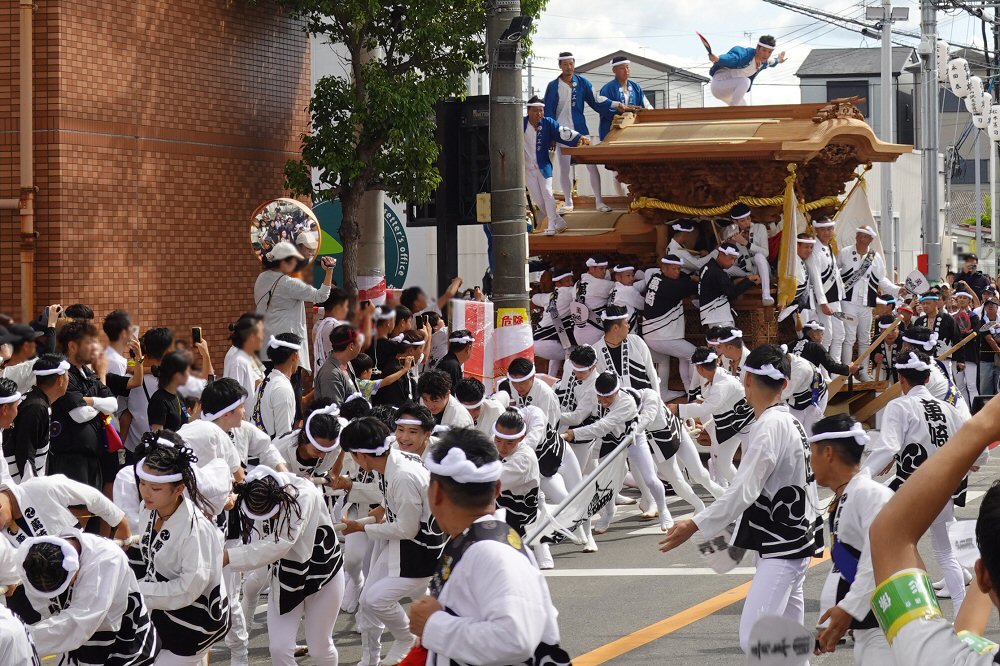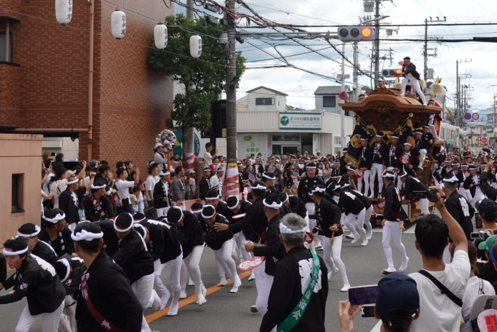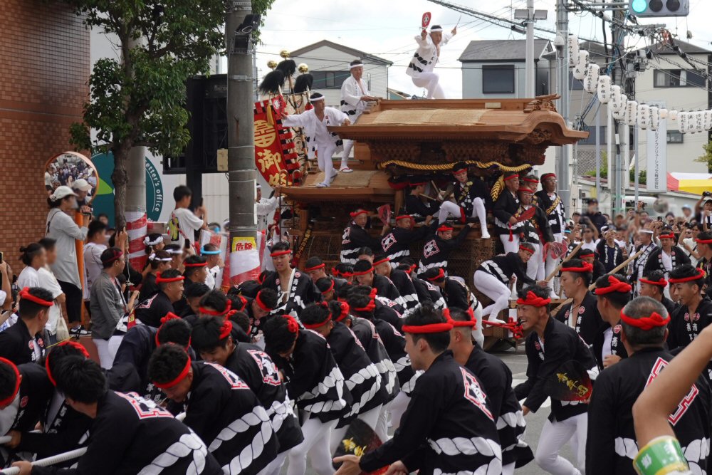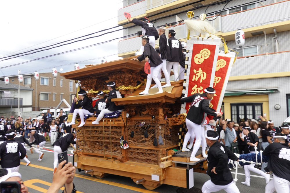 令和7年9月21日、鳳地区と福泉地区試験曳きでの万代前交差点の様子です。 良い天気に恵まれ、暑さも少しやわらいでだんじり日よりでした。