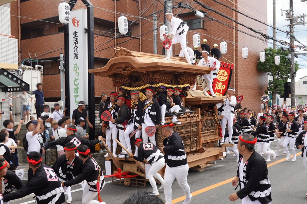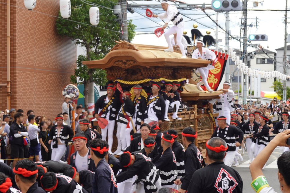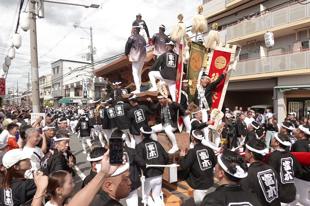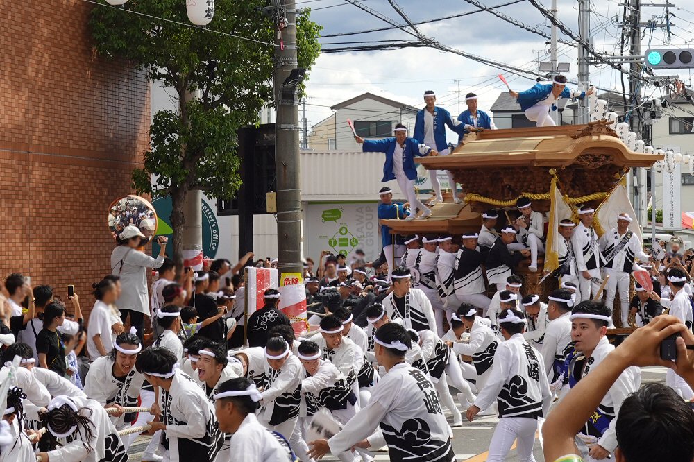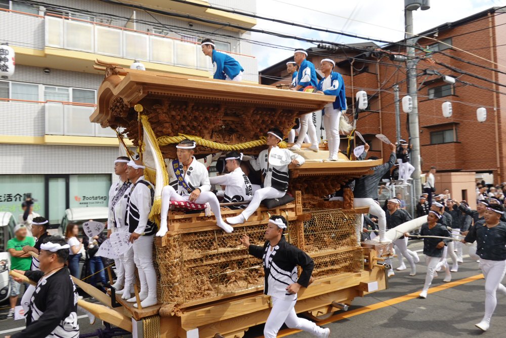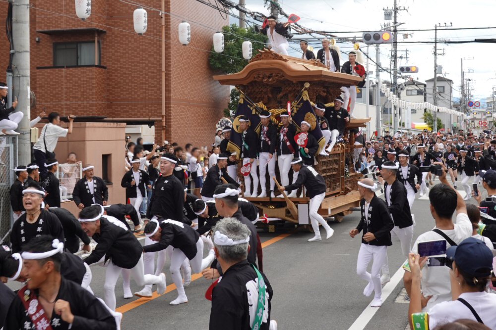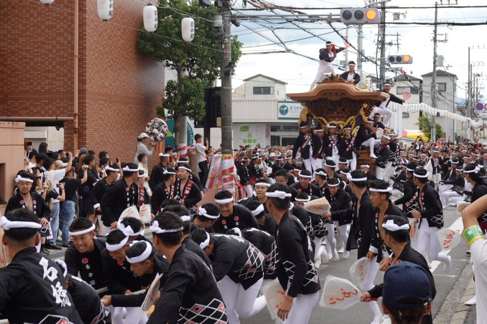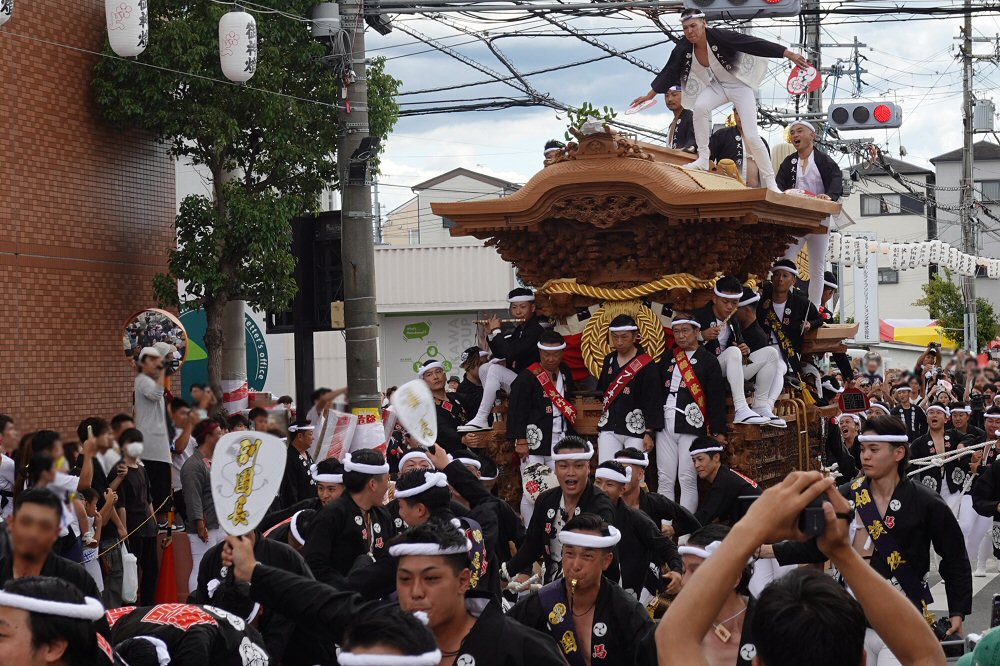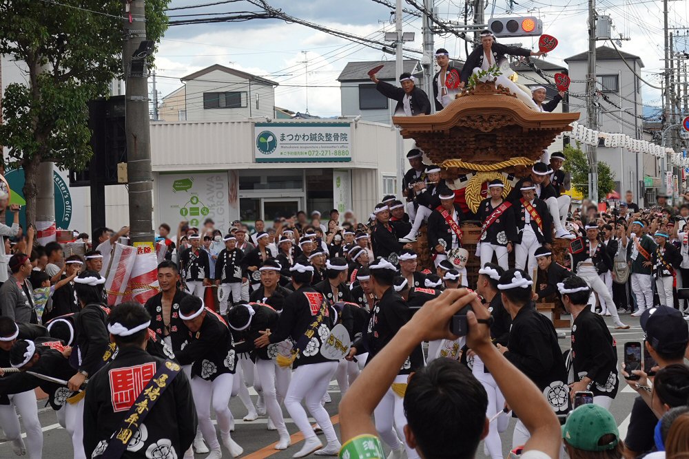 令和7年9月21日、鳳地区と福泉地区試験曳きでの万代前交差点の様子です。 良い天気に恵まれ、暑さも少しやわらいでだんじり日よりでした。