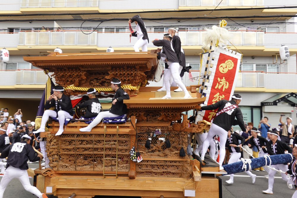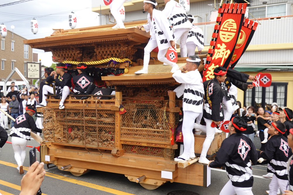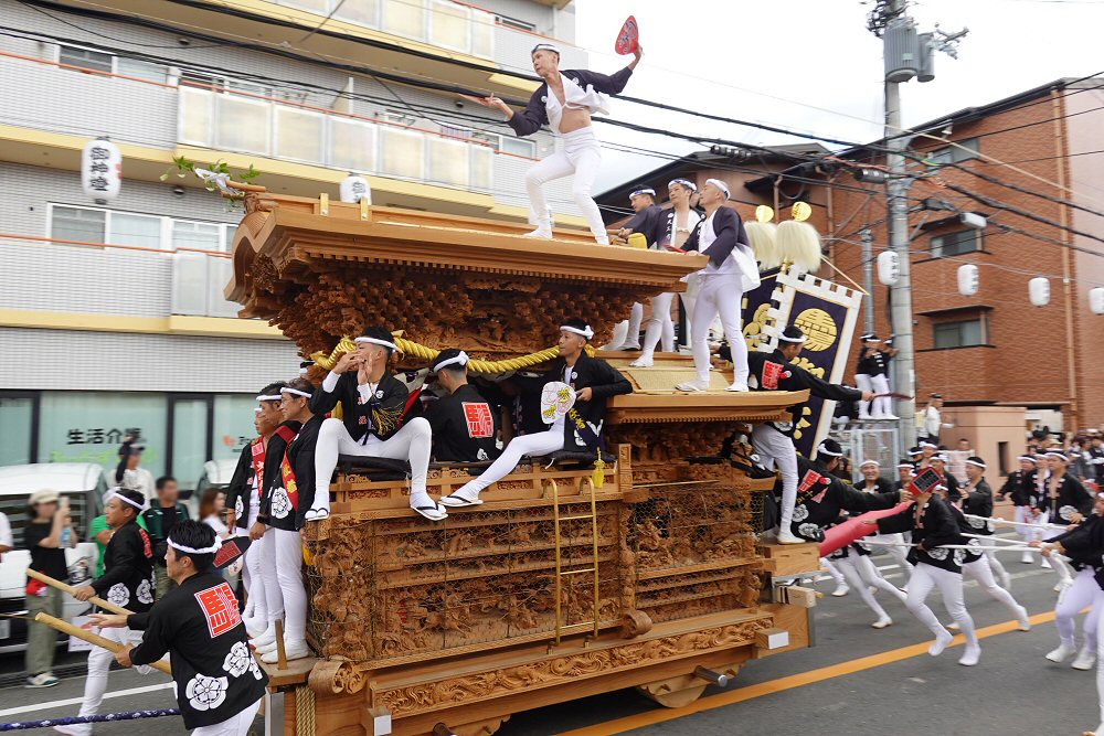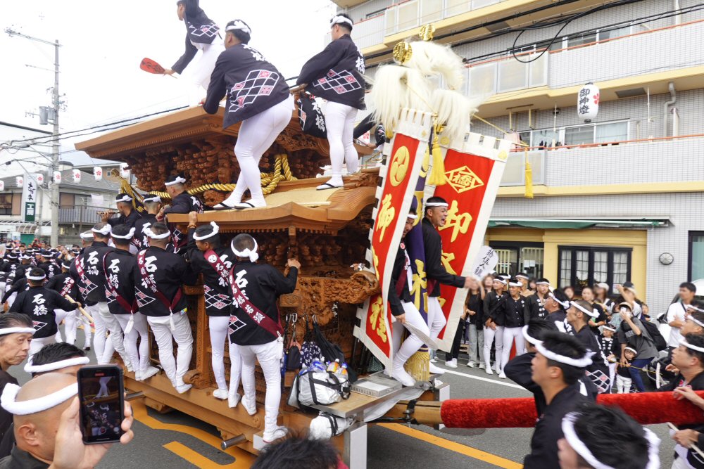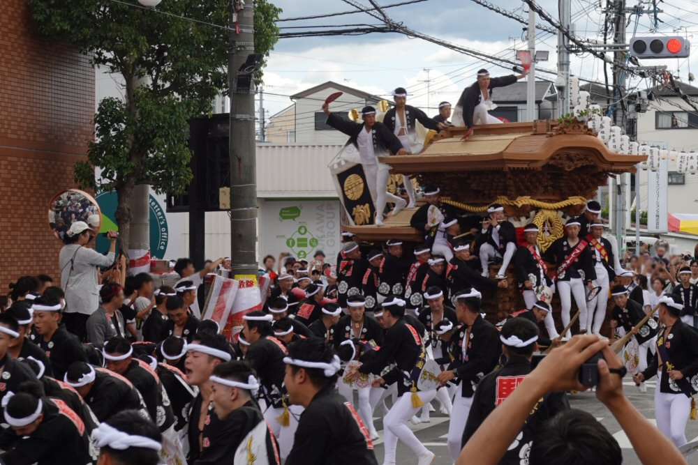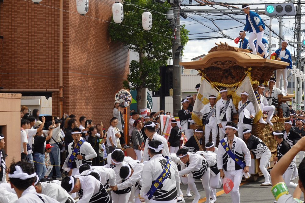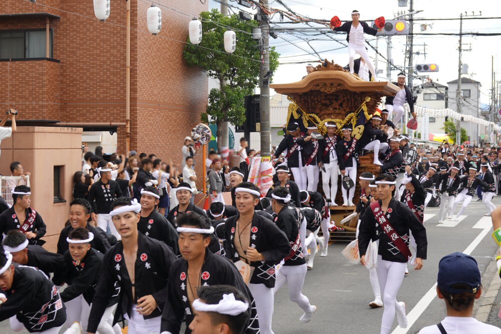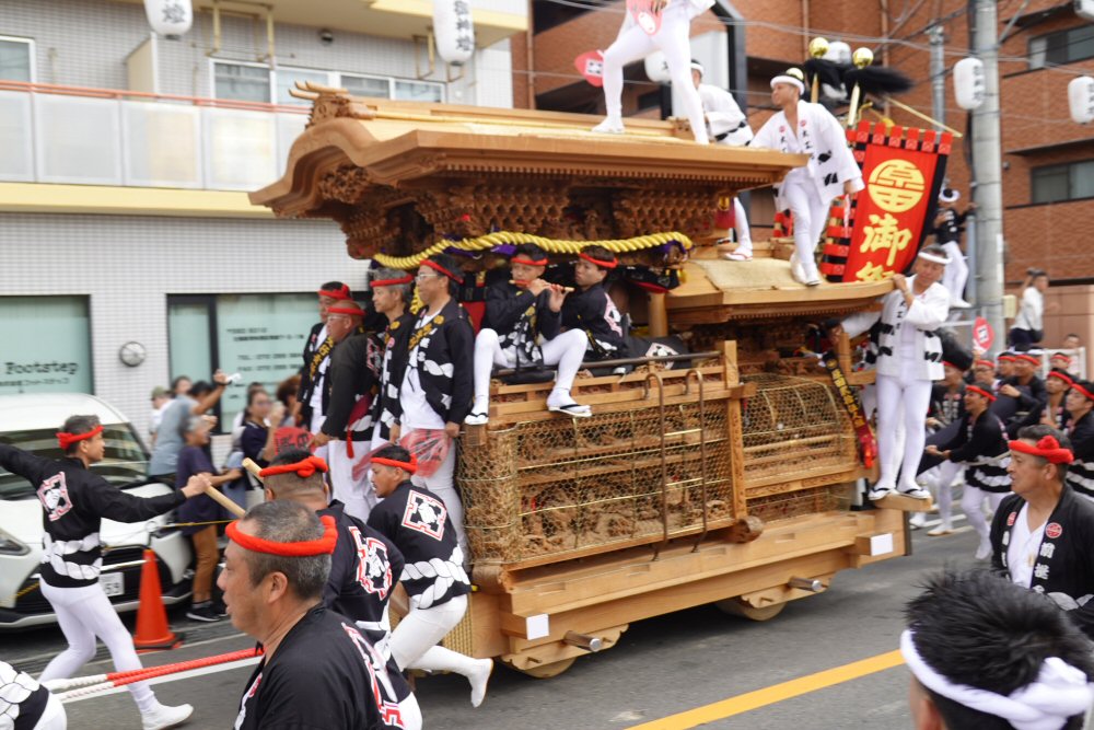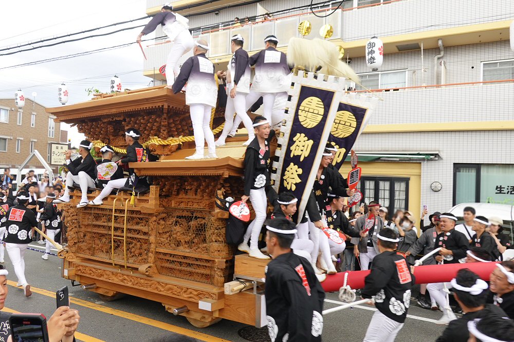 令和7年9月21日、鳳地区と福泉地区試験曳きでの万代前交差点の様子です。 良い天気に恵まれ、暑さも少しやわらいでだんじり日よりでした。