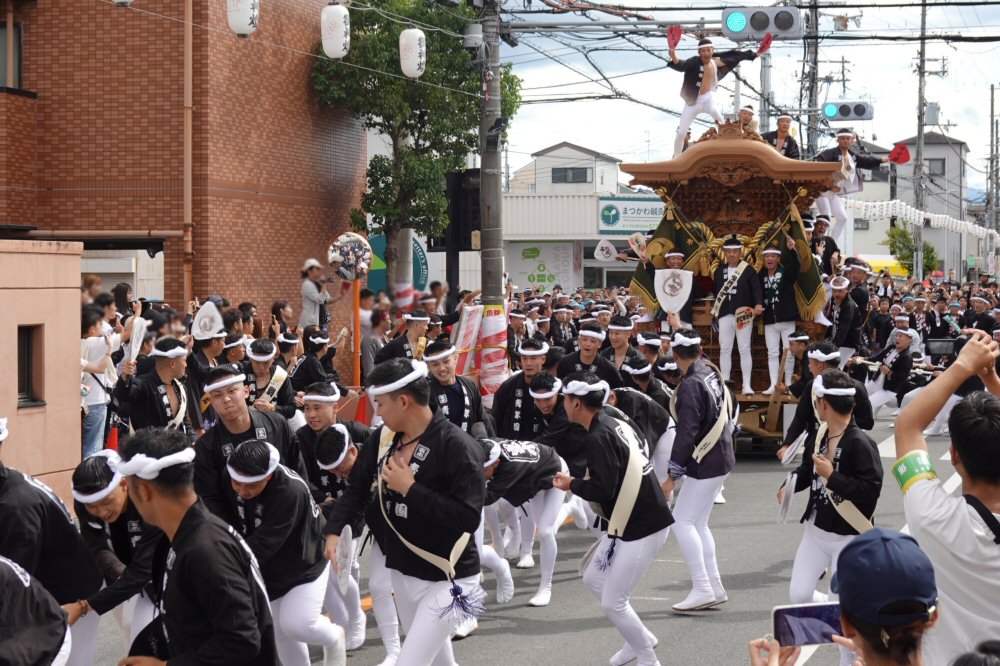 令和7年9月21日、鳳地区と福泉地区試験曳きでの万代前交差点の様子です。 良い天気に恵まれ、暑さも少しやわらいでだんじり日よりでした。